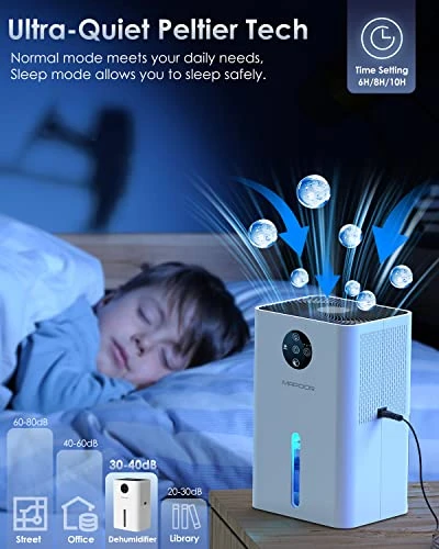 - Ultra-Quiet, Sleep-Friendly: The dehumidifier for bedroom is designed with efficiency mode and sleep mode that meet everyone’s various needs. You can freely switch between 2 modes. When you turn on sleep mode, the running noise drops to below 30 db. Turn on sleep mode to automatically turn off light mode. Creating an ideal sleep environment, let you sleep peacefully.