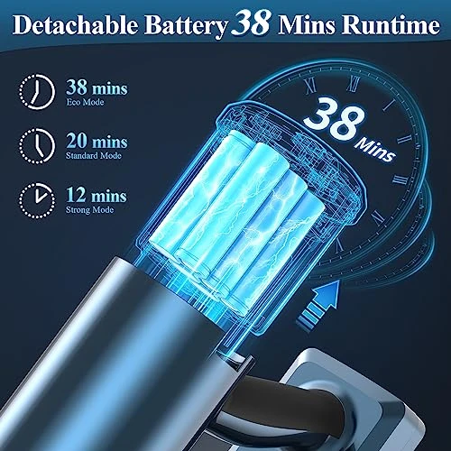 - ✨【Removable Battery with 38Min Long Runtime】:The EICOBOT vacuum cleaner is equipped with a removable battery for easy charging can be switched between three modes: Eco mode (15KPa suction for 38 mins), Standard mode (20KPa for 20 mins), and Strong mode (28KPa for 12 mins).