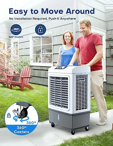 - ❄【4 Rolling Casters Movable to Indoor/Outdoor Use】With 4 smooth-rolling casters, our portable swamp cooler can be effortlessly moved around your home, from your living room to your yard. Even the elderly can move it with ease. With 2 lockable wheels, you can secure the unit in place once you find the perfect spot. Ideal for use in garage, workshop, coffee shop, and more. Choose our portable air cooler for ultimate flexibility and convenience in cooling your space this summer!