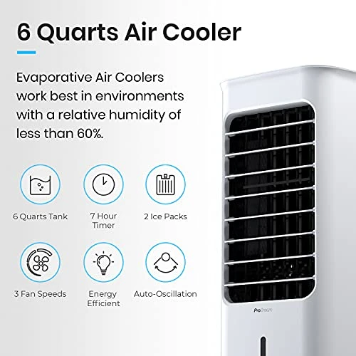 - ENERGY EFFICIENT & COST-SAVING – Go easy on the planet AND your pockets this summer with the no vent air conditioner Pro Breeze evaporative air cooler portable. It runs at just 0.0065 kw/h, which is much more energy efficient than an air conditioner, which runs at around 0.5 kw/h. Stay cool, stay thrifty and stay eco-friendly with our cooling fan portable.