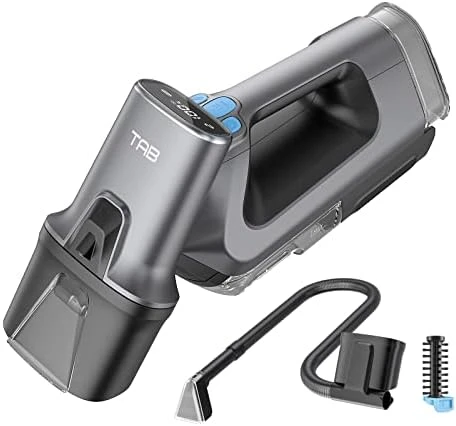 - 【PowerBrush & Extend Hose】One of the standout features of the TAB Wireless Spot Cleaner is its PowerBrush, which can helps to agitate and lift dirt and stains from deep within the fibers of your carpets and upholstery. You can choose to turn on or off the power brush independently through the button on the body. The Extend Hose is another great feature that allows you to easily clean hard-to-reach areas such as crutains, stairs, corners, and crevices.
