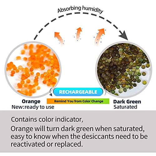 - Indicating orange silica gel beads will change to dark green when 50-60% absorbed with moisture; Still almost half more capacity is left to absorb moisture even after color change.