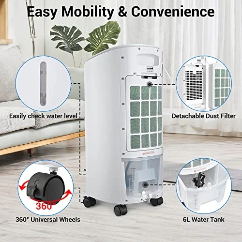 - [Easy Mobility & Convenience]: Equipped with 4 universal swivel casters and 2 side design handle to ensure smooth movement in all directions, you can easily move it to different rooms-whether you’re relaxing in the living room, cooking in the kitchen, or working in your home office, along with a visible front window for checking the water level easily so you can refill it in time; Built-in detachable dust filter effectively keeps dust out to make the fan stay clean.